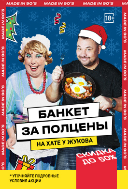 Если у вас большая компания, то вы получаете от Сергея Жукова банкет со скидкой до 30%! И на этом подарки не заканчиваются! При праздновании вы получаете новогоднюю арт-программу в стиле 90х — БЕСПЛАТНО
